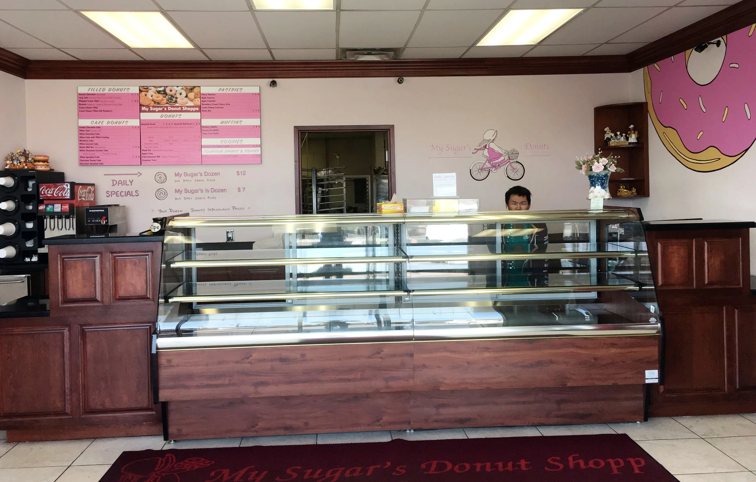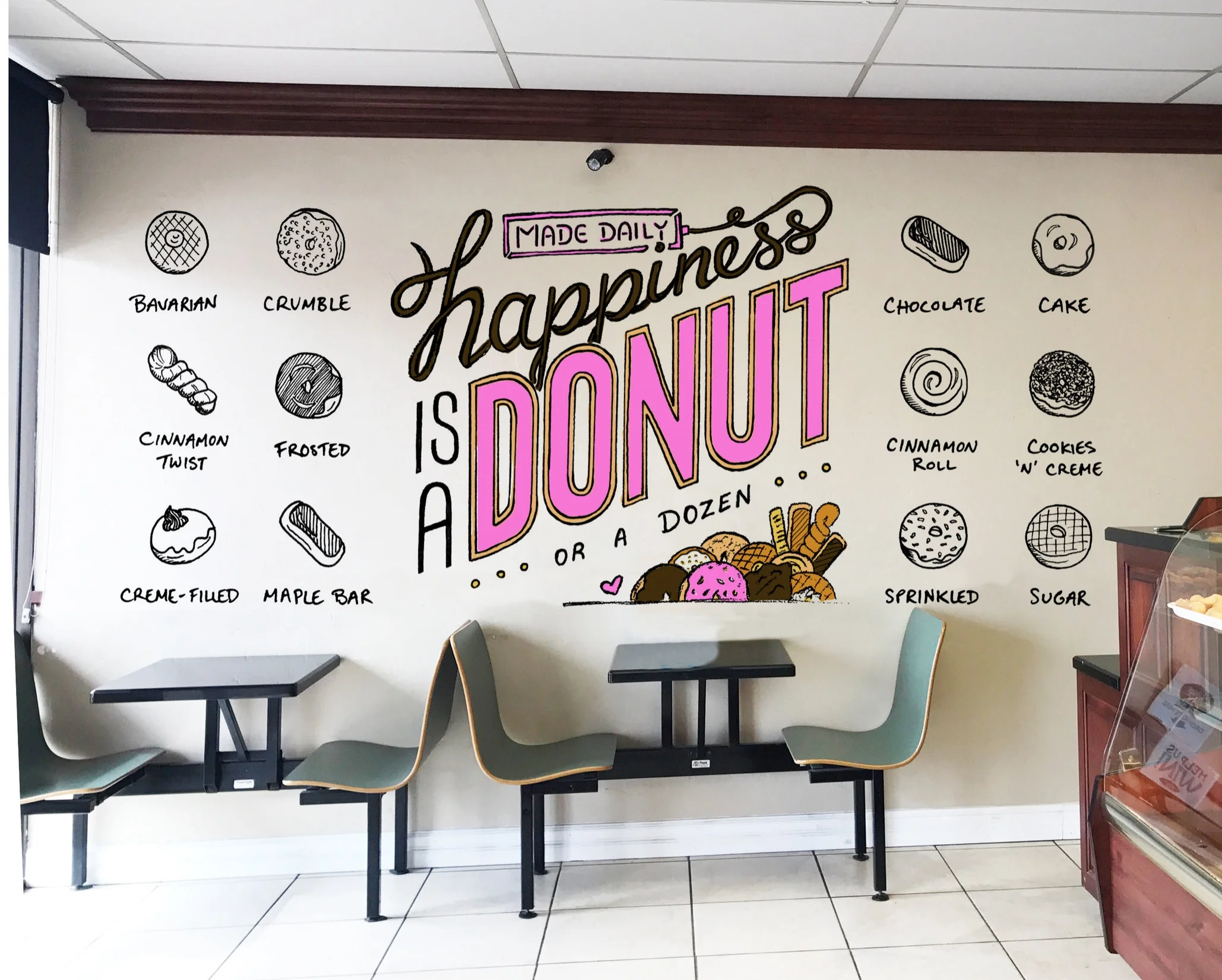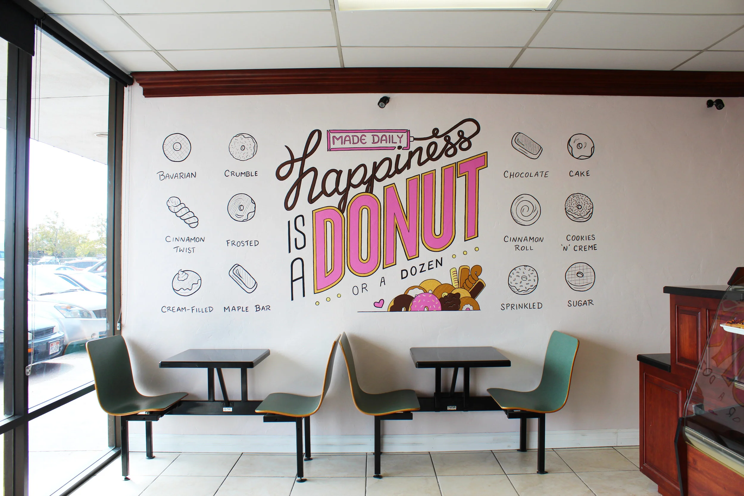 My Sugar's Donut Shoppe is a small mom & pop shop, well-known in the area for their delicious, daily-baked donuts. Although the place was welcoming, it felt a bit cluttered and dated. We revamped the place with 2 fresh new colors, and murals on all 3 walls – for a more bright, inviting, and fun environment.
