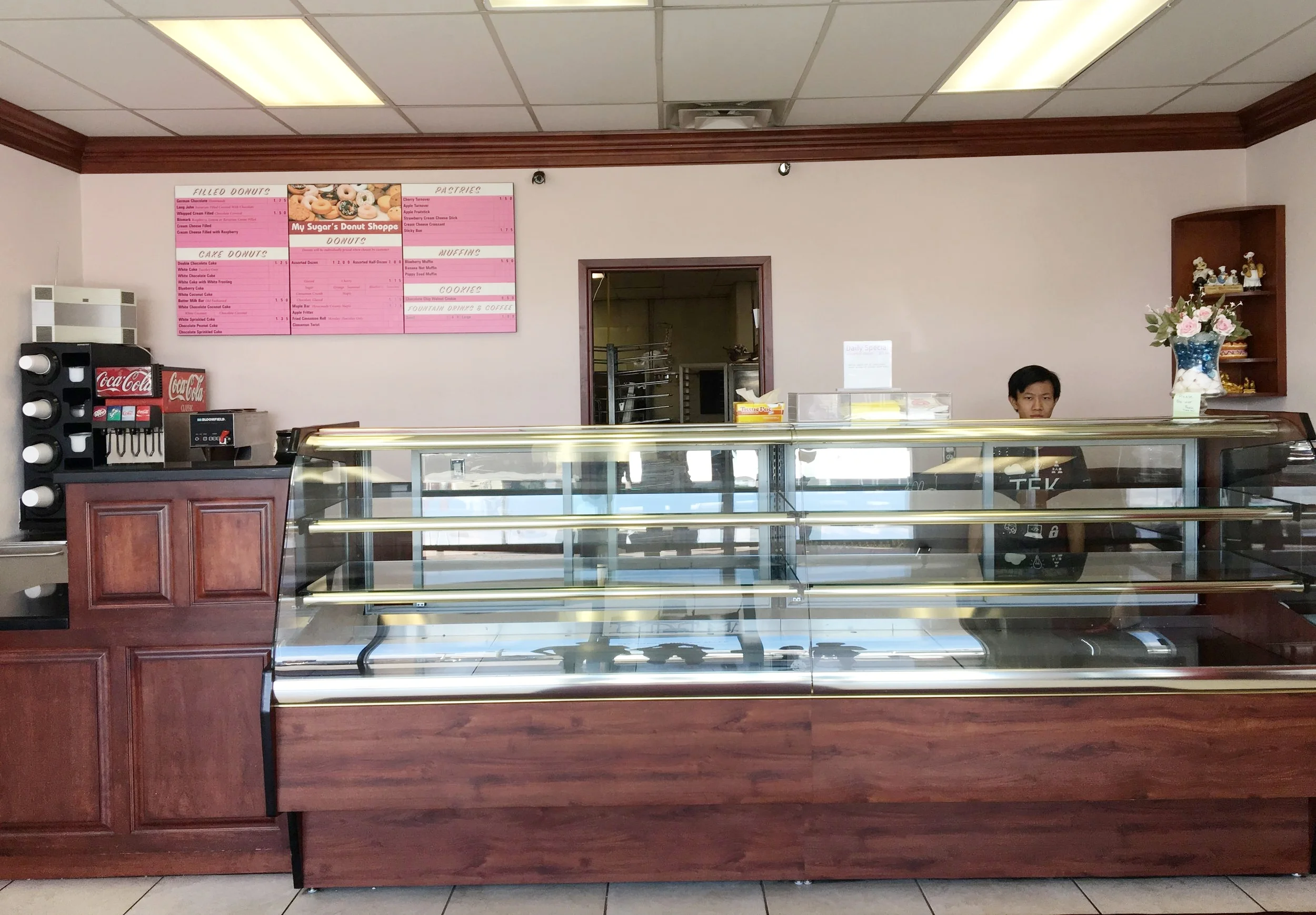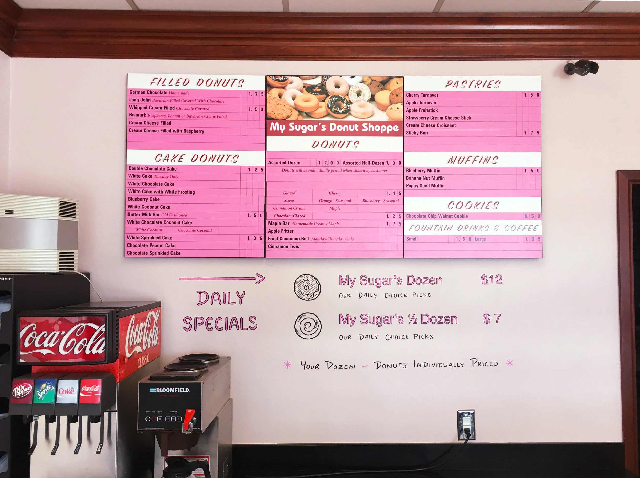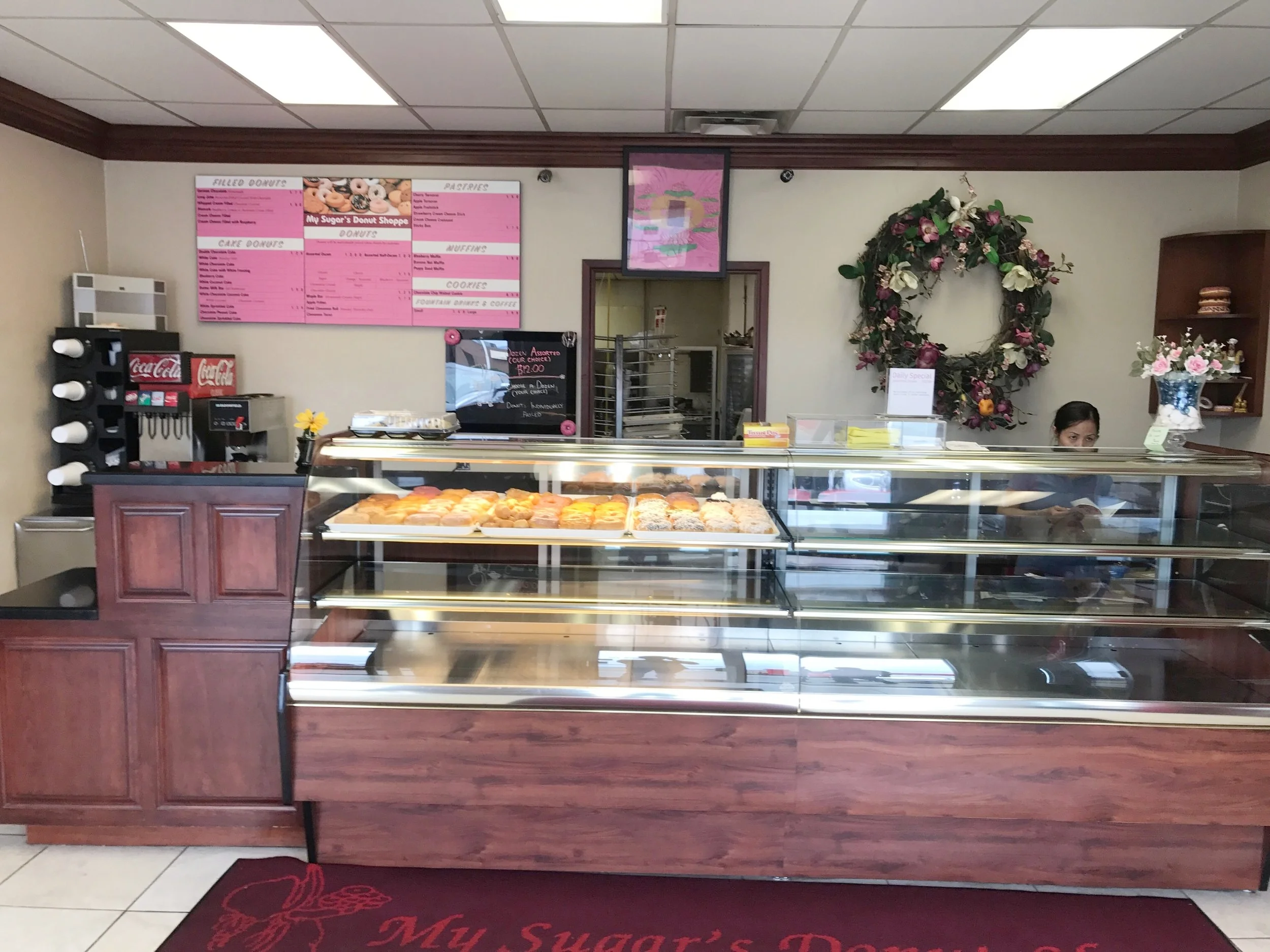 My Sugar's Donut Shoppe is a small mom & pop shop, well-known in the area for their delicious, daily-baked donuts. Although the place was welcoming, it felt a bit cluttered and dated. We revamped the place with 2 fresh new colors, and murals on all 3 walls – for a more bright, inviting, and fun environment.