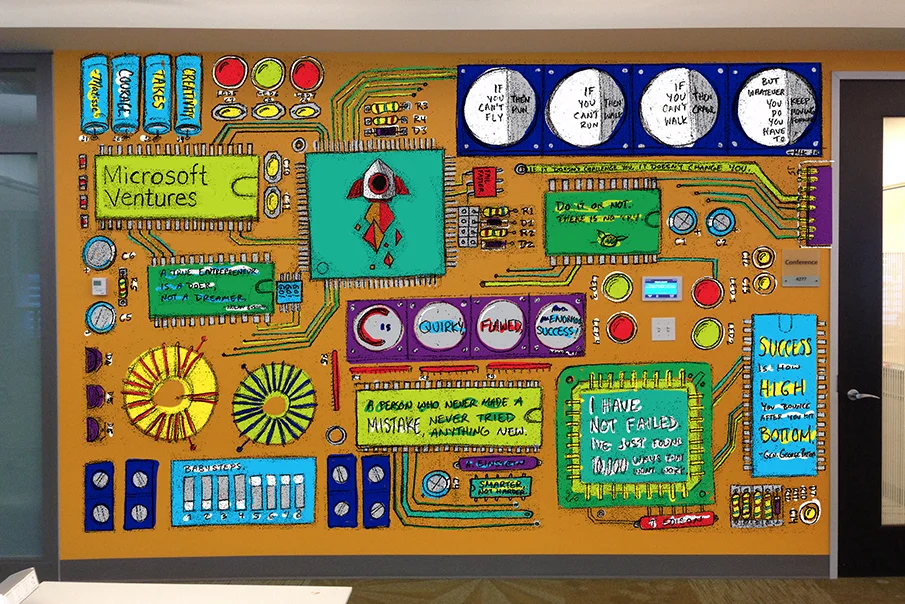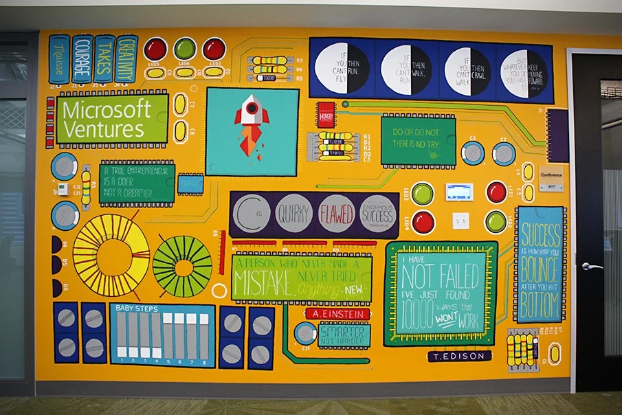 Microsoft Ventures works with startups full of coders and engineers. In order to come up with a design that relates and works with the obstacles (light switch panel, thermostat,...etc.), I thought of a circuit board. Although most commonly green, some circuit boards are orange. The circuit board is designed to make the obstacles part of the piece and even correlate with LEDs around the light switch panel and LCD screen. The parts on the board allowed me to integrate several motivational quotes to keep the viewers' eyes moving.