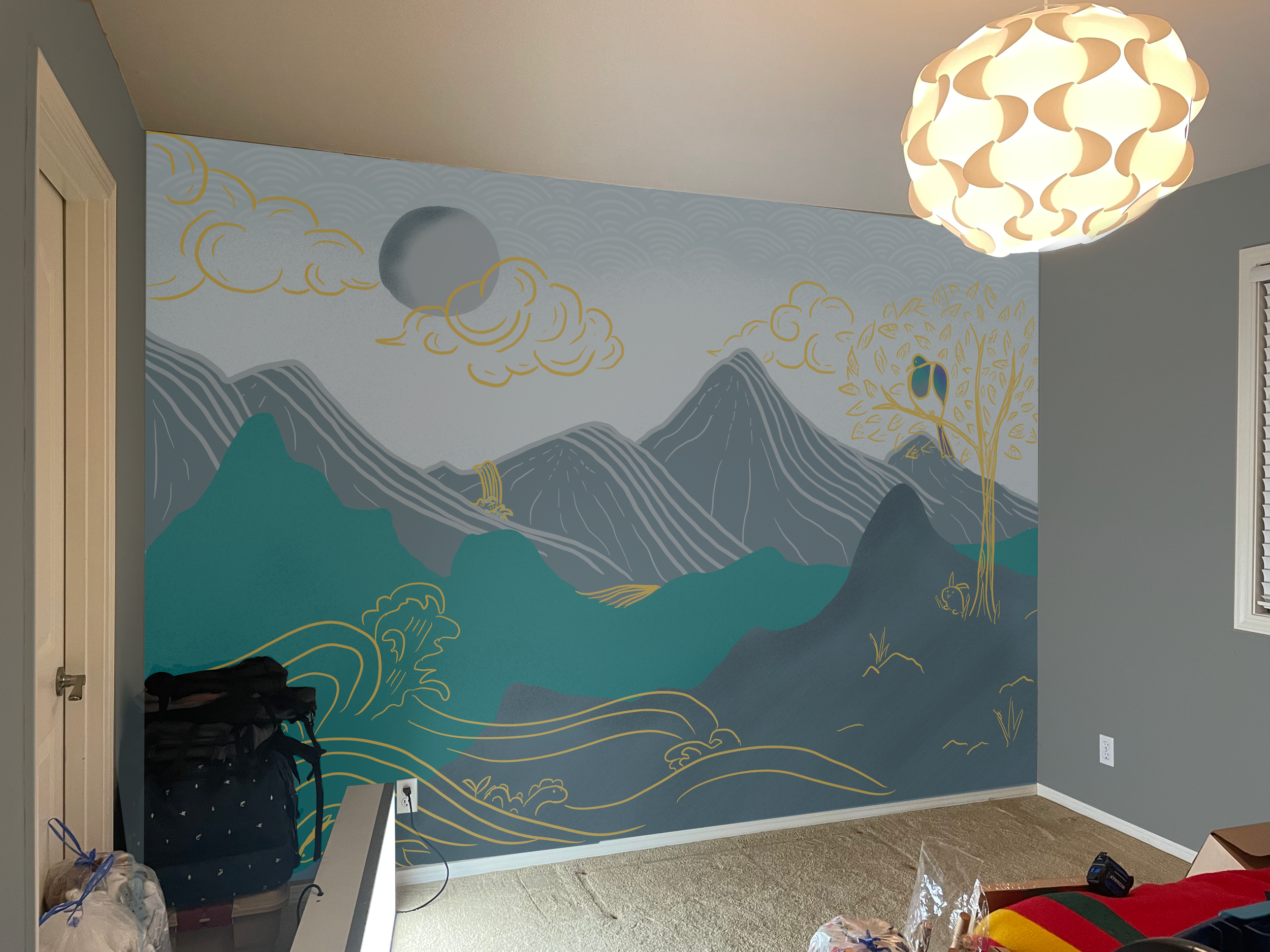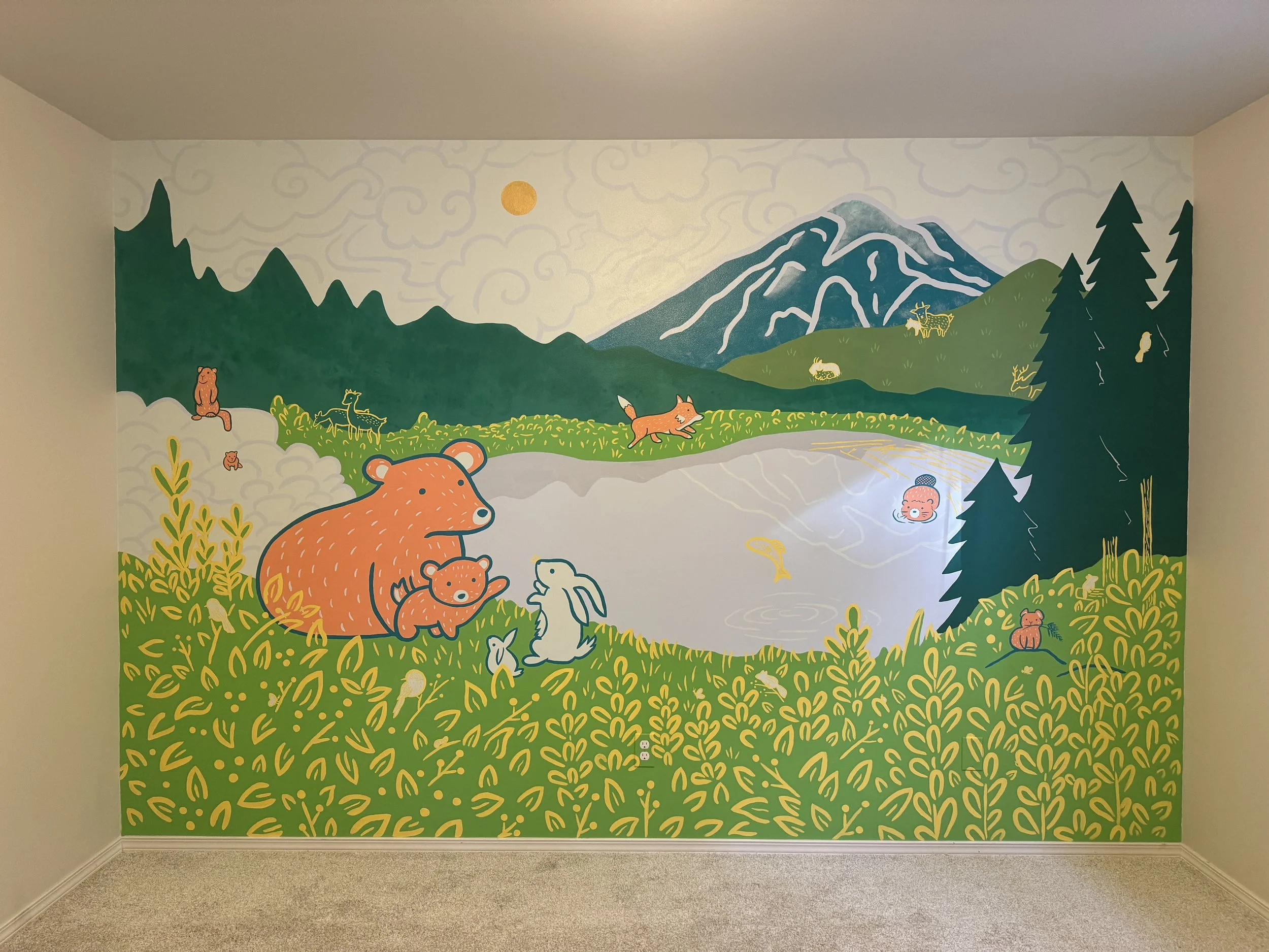 Finished Mountain Creatures mural and repainted 3 other walls + ceiling with colors from the mural palette.
