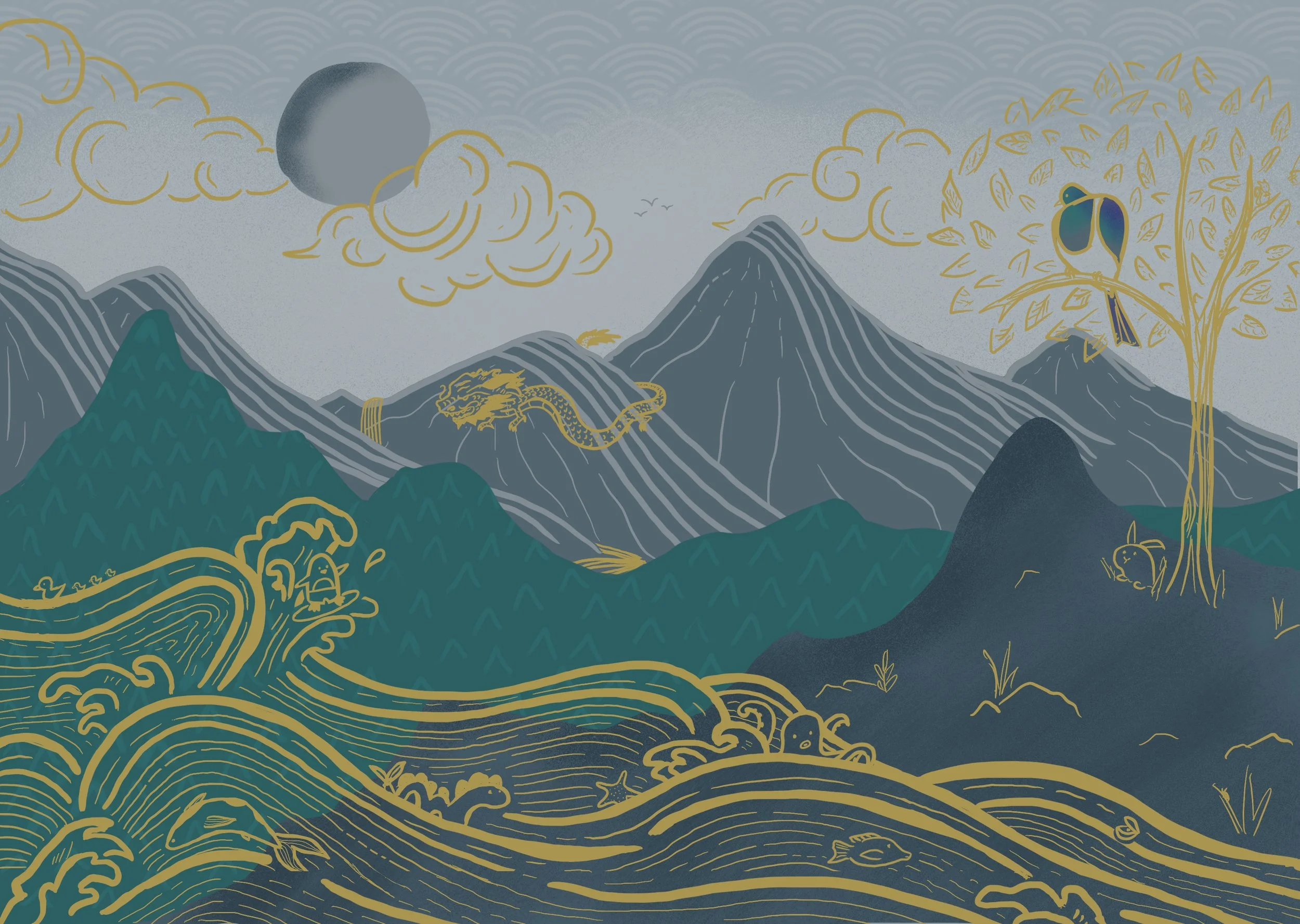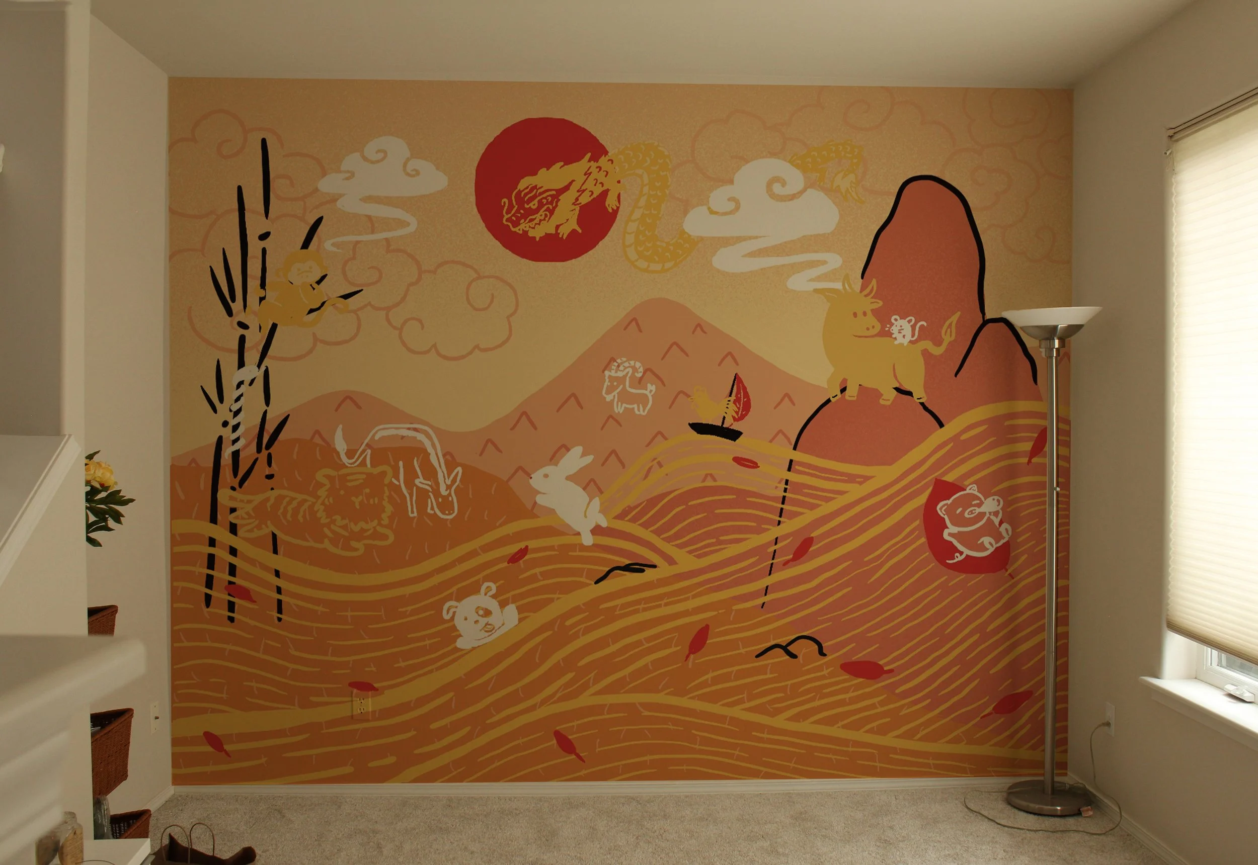 After designing and painting the Mountain Creatures mural, I wanted to paint something in the same style, but different. Growing up, my family was oddly proud of whatever zodiac animal they were – We would also use people’s zodiac signs to tell what age someone is. (ie. “Auntie is also a snake, so she is either 12 or 24 yrs older than you.”) With my dad passing last year, I wanted to put him (born in the year of the Ox) on the mountain, as if watching over us. The Rat sits on the Ox to cross the finish line, like in the zodiac race story. I love that my mother-in-law and father-in-law are also born in the year of the Rat, so the dads are just on the mountain, lovingly side-eyeing everyone.